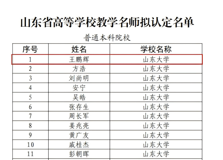 在教育教学改革方面,王鹏辉也积极参与探索与实践,其参与完成的项目获国家教学成果奖二等奖(3/10)、山东省教学成果奖特等奖(3/10)。此外,他还荣获宝钢优秀教师奖、山东大学优秀教师奖(“四有”好老师)、教育部拔尖2.0“优秀教师奖”等荣誉,展现出在人才培养方面的持续投入与扎实成效。
